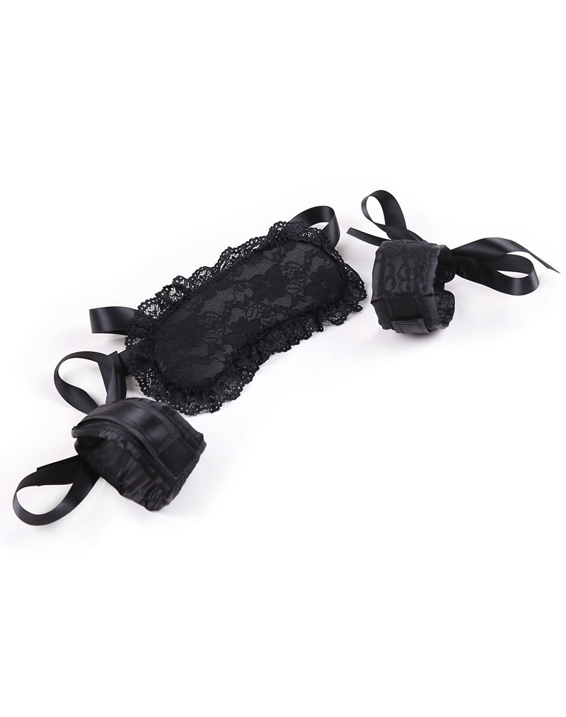 Η μάσκα και οι χειροπέδες είναι σε σατέν ύφασμα και στολισμένες με μαύρη δαντέλα.